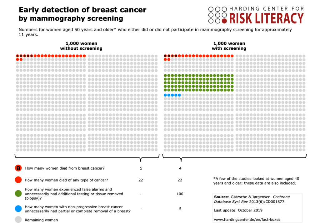 You’ve probably heard “Regular mammograms reduce breast cancer deaths by 20%” . Numerous national breast cancer organizations—including the American Cancer Society, American Society of Breast Surgeons, U.S. Preventitive Services Task Force (USPSTF), Prevent Cancer Foundation and many others —strongly advocate for regular mammography citing mortality benefits. Their education and outreach reinforce messaging such as “early detection saves lives,” often summarizing this as a 20% reduction in breast cancer mortality. That sounds impressive, right? But let’s break it down. This is one of the most misleading aspects of mammography promotion since the number refers to relative risk and not the actual number of lives saved.